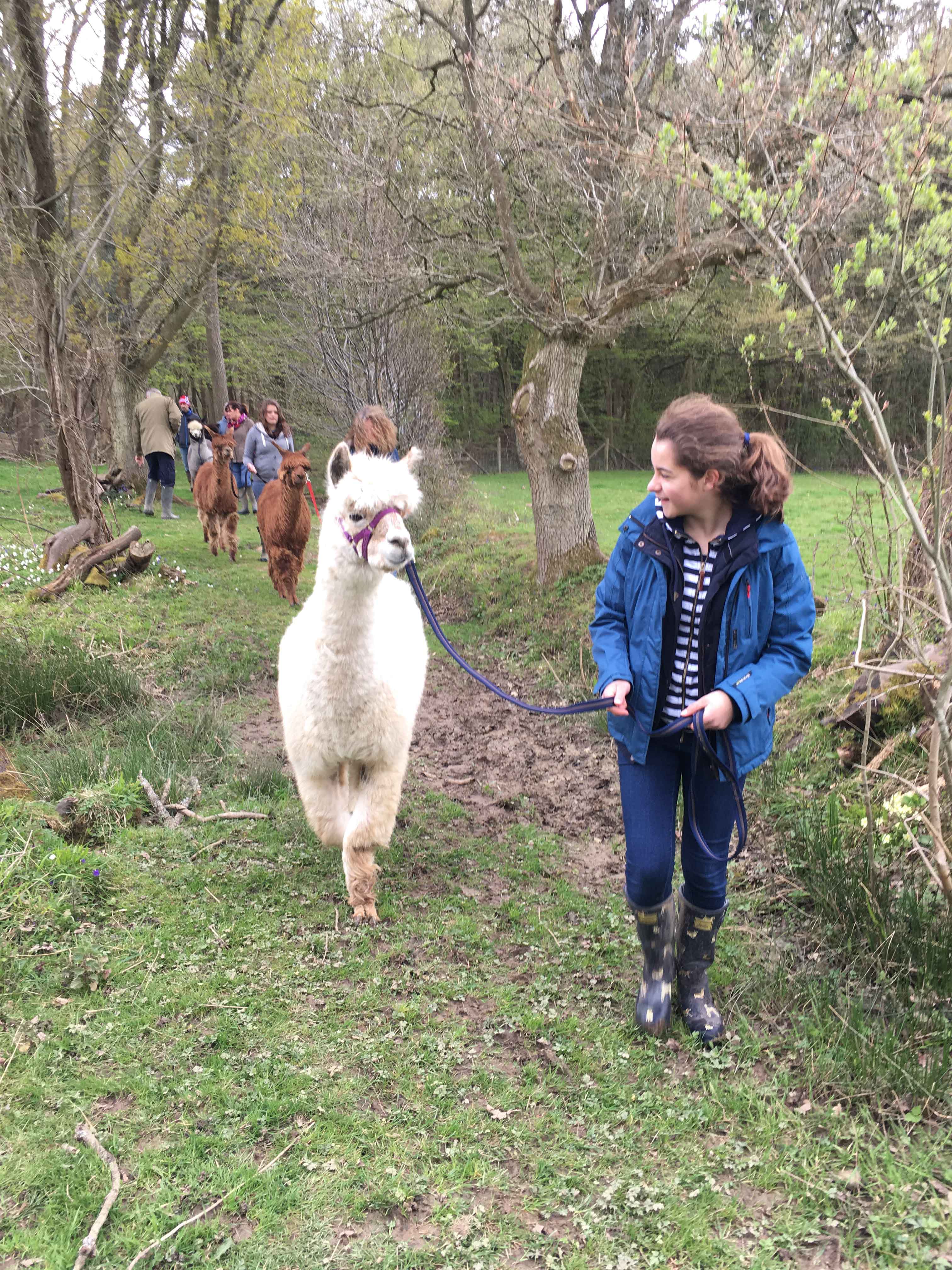 Alpaca walk with bluebells